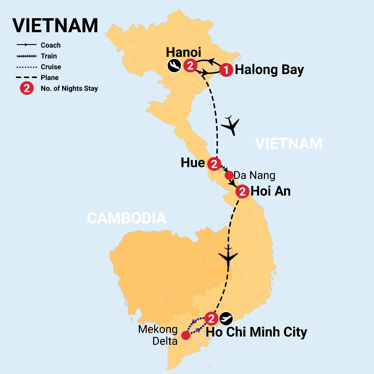 - All internal flights, coach, boat and rail transportation
