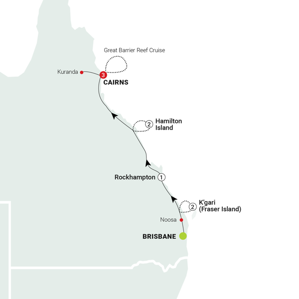 - Discover the World Heritage-listed K'gari (Fraser Island) Enjoy a full day exploring K'gari by 4WD Marvel at Lake McKenzie's stunning turquoise water and silica-white sand Discover K'gari iconic sites such as 75 Mile Beach and Maheno Shipwreck Delve into the outback spirit and visit a historic cattle station Cross the Tropic of Capricorn Visit the Sarina Sugar Shed Discover the idyllic Whitsunday Islands and enjoy a relaxing stay on Hamilton Island Explore tropical Cairns Enjoy a full day cruise on the iconic Great Barrier Reef Explore Kuranda nestled in the World Heritage-listed rainforest Glide above the tropical rainforest aboard the Skyrail Rainforest Cableway