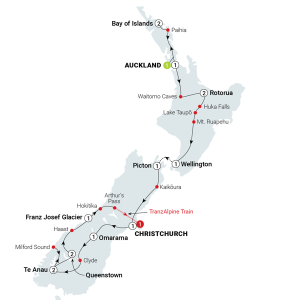 It’s hard to pick a highlight of this New Zealand tour from north to south. Is it the fiords and glaciers of Milford Sound/Piopiotahi, explored on a tour? The gem-like Bay of Islands from Auckland? The bubbling geysers and thermal springs of Rotorua? Or perhaps the mountain vistas of Queenstown? In between you have cosmopolitan cities, wineries, train rides, beaches… how does one country pack so much punch?