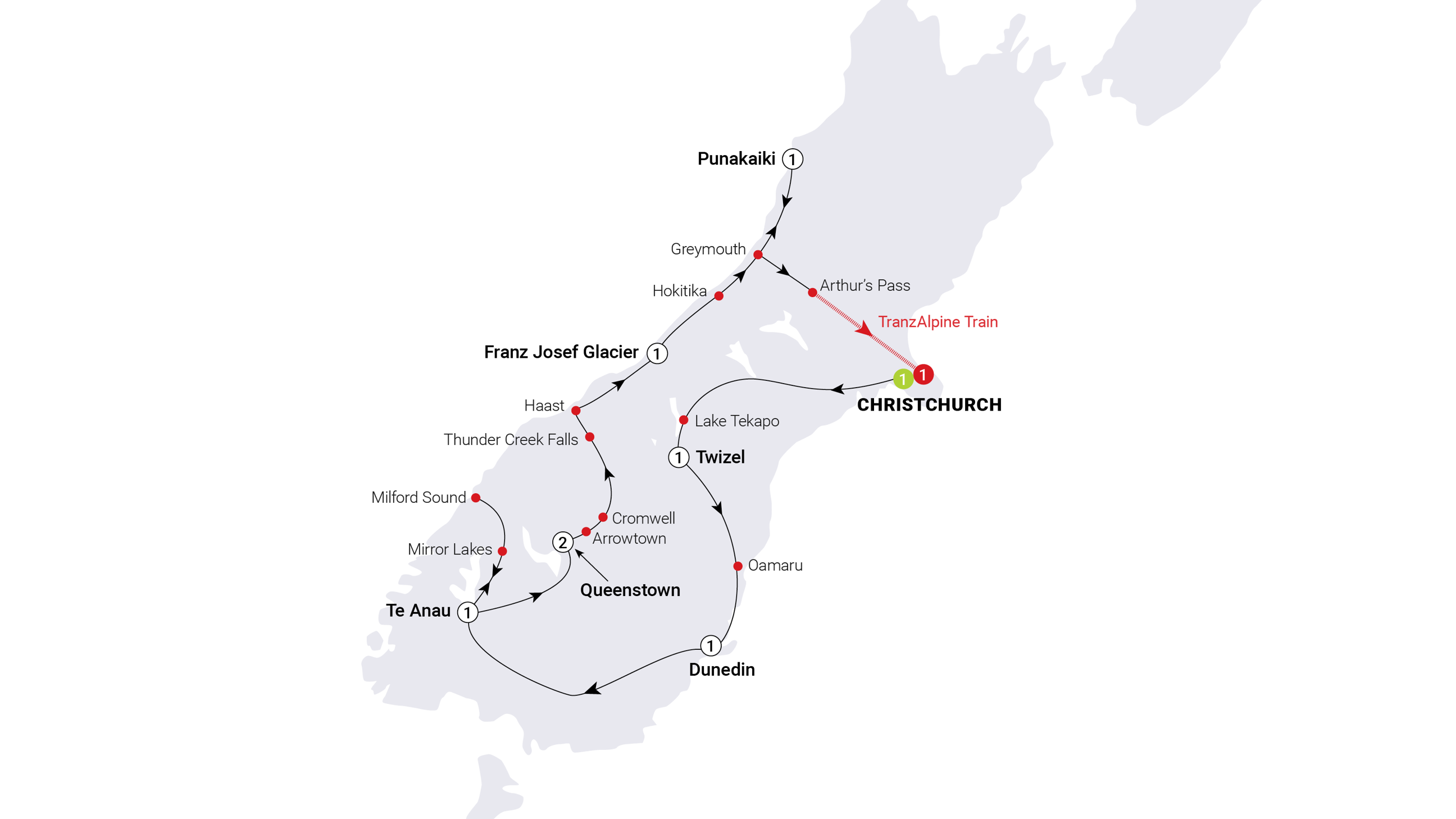- Enjoy a Be My Guest afternoon tea at the home of the Pavlova Queen at Lake Tekapo MAKE TRAVEL MATTER® Experience - Embark on a thrilling jet boat ride where your participation contributes to a local conservation project Embark on a cruise in Milford Sound/Piopiotahi and admire towering cliffs, cascading waterfalls, and untouched fiord scenery in Fiordland National Park Cruise Lake Wakatipu to Walter Peak on TSS Earnslaw Steamship Relish a gourmet BBQ dinner and farm show at Walter Peak High Country Farm See Franz Josef Glacier from a panoramic viewpoint Visit Pancake Rocks and stay at an Eco Resort located on the beach at Punakaiki Tour Pounamu Pathway, a cultural journey celebrating New Zealand’s treasured greenstone and its deep spiritual significance to Māori Experience one of the world’s great train journeys aboard the TranzAlpine through the Southern Alps View the Church of the Good Shepherd at Lake Tekapo