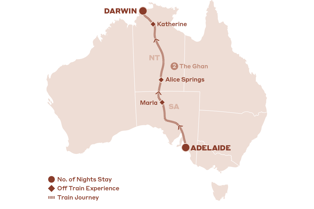 • 3 days / 2 nights aboard The Ghan, travelling from Adelaide to Darwin