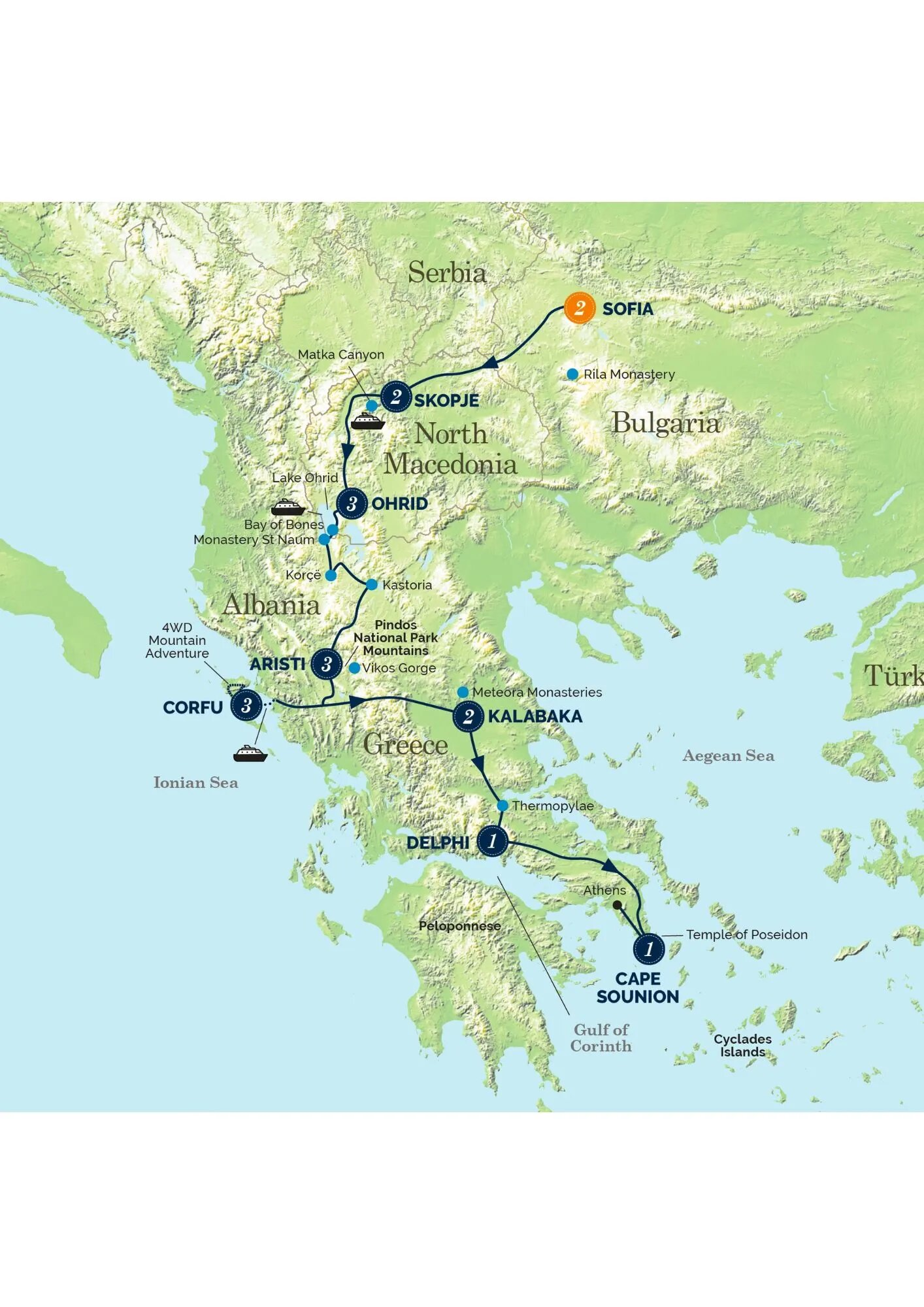 From beautiful Sofia, wind your way all the way down the Balkan Peninsula, relaxing in North Macedonia, touching Albania and really getting beneath that tourist veneer in Greece. In Bulgaria enjoy a visit to the exquisite Rila Monastery before lunch beside a tumbling river. In North Macedonia relax in Alexander the Great’s Skopje, with its enormous statues, and grand old Turkish Bazaar before cruising under the cliffs of the gorgeous Matka Canyon to the Vrelo Caves. Savour over three nights beside the shores of delightful Lake Ohrid, take in the panoramic views of the lake from Tsar Samuel's Fortress, enjoy a lake cruise to visit Naum Monastery, the Freshwater springs and lakeside lunch. Discover the UNESCO listed ‘Bay of Bones’ reconstructed village built of wooden piles sunk into the crystal-clear lake waters, drive deep into Greece’s spectacular Pindos Mountains to stay three nights in the fabulous, multi award winning Aristi Mountain Resort. Explore the UNESCO listed Zagori region known for its steep mountains and cliffs, perched Monasteries, stone bridges and timeless feeling remote villages, and dine on a shady terrace with views across the enormous Vikos Gorge. Visit Corfu, explore the old town and take an exclusive 4WD tour deep into the mountains, for a remote village lunch. Stay 2 nights in Kalabaka and visit three of Meteora’s amazing, perched monasteries, visit Delphi’s incredible ruins and dine in a shady restaurant high over the olive tree filled plains and the Sea of Corinth. At Thermopylae, take in the site of the famous Spartan stand against the Persians and spend a final night beside the beach nearby beautiful Cape Sounion. After a refreshing dip in the crystal-clear sea, relax through the evening beside the magnificent 2,500-year-old, cliff top ruins of the Temple of Poseidon and take in the awesome sunset spilling over the Aegeon Islands. What an adventure!