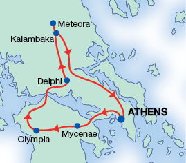 This is a customised itinerary combining regular tours and individual services. Discover all the ancient sites of Greece from the Acropolis & Olympic Stadium in Athens to the sites of Mycenae, the Amphitheatre at Epidaurus and the seaside town of Nafplio. Marvel in the sites of the Kalambaka and Monasteries of Meteora with Byzantine Art. This program includes 3-night stay in Athens and 4 days/3 night coach tour of the mainland.