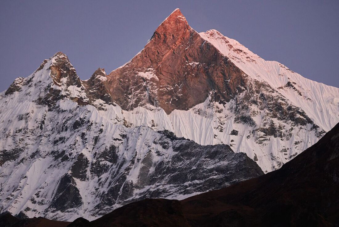 Wake up early for the beautiful sunrise view in Base Camp! You're close enough now to (almost!) reach out and touch the peaks of Annapurna 1 (the 10th highest mountain in the world), Macchapucchhre, Annapurna South, Tent Peak, Gangapurna, Himchuli and Annapurna 3. After watching a sunrise on these snowy peaks, head back down the valley the same way to Bamboo (or further if the knees can handle it). It’s a long day but you have plenty of time to get there.