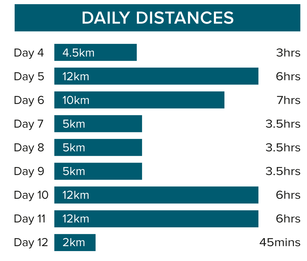 Today's 10-kilometre/6.2-mile walk is expected to take around seven hours with a total ascent of 1,060 metres/3,500 feet and a descent of 620 metres/2,000 feet.
