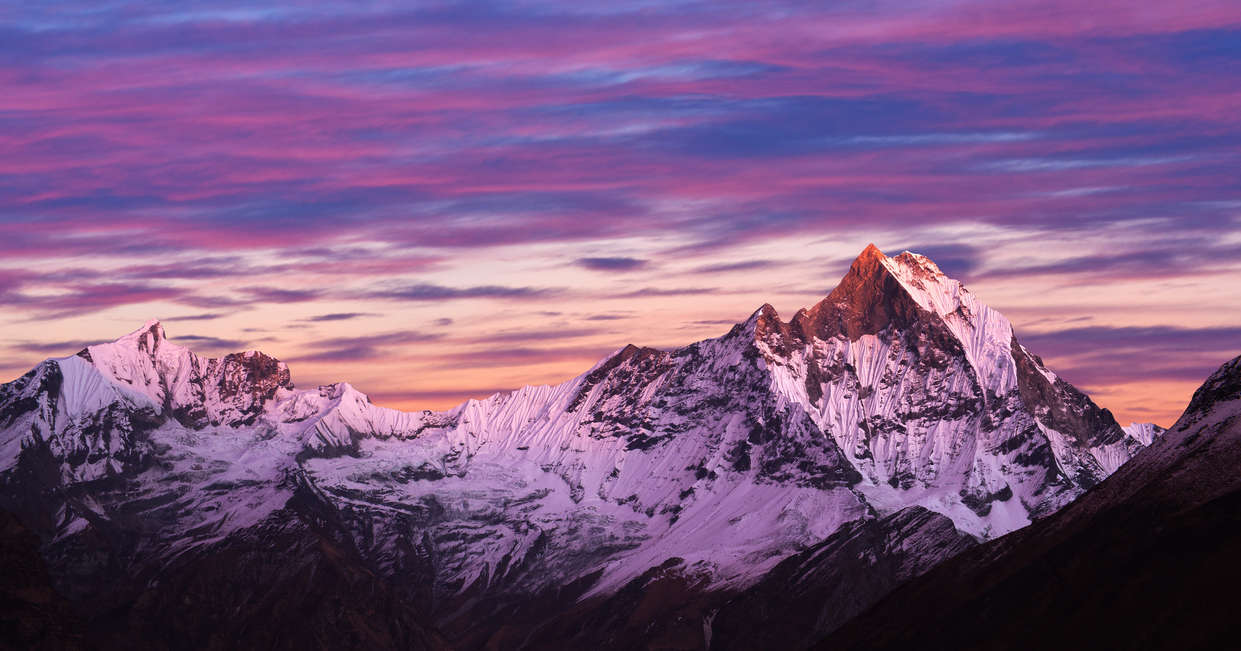 Today we climb further to pass between Machhapuchhre and Huinchuli - the 'Gates' into the Sanctuary. Climbing over the rocky moraine we arrive at Machhapuchhre Base Camp (3,720 metres/12,200 feet). Overshadowed by Annapurna South and the beautiful shape of Machhapuchhre (machha, fish' and puchhre, 'tail'), one of Nepal's holy mountains, this is a quite awe-inspiring setting in which to end our day's trekking, the mountain landscapes providing us with a sight to raise the spirits of even the most tired amongst us.