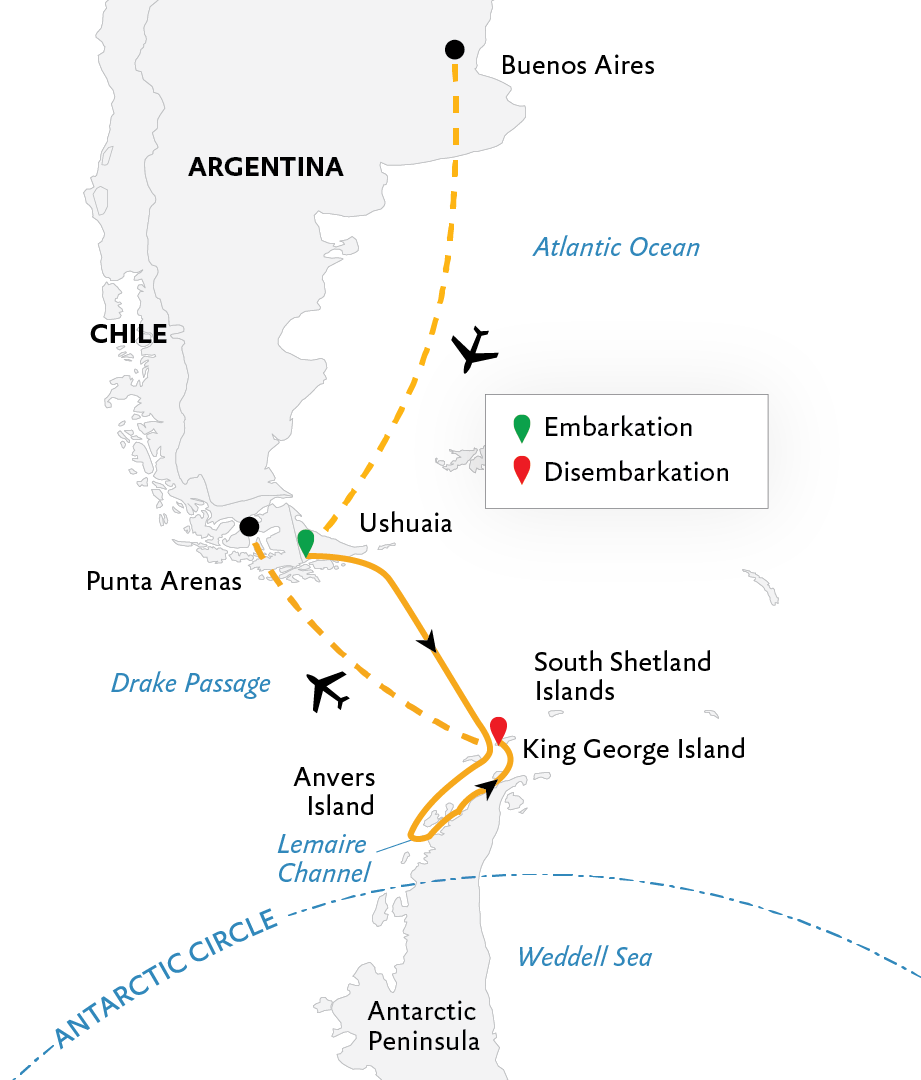 Spot iconic Antarctic wildlife, such as penguins, seals and whalesFly over the Drake Passage and experience the fastest, most direct way to AntarcticaEnjoy presentations on wildlife, history, glaciology & geology by our onboard polar expertsCruise in a Zodiac to get water-level views of icebergs, wildlife and more