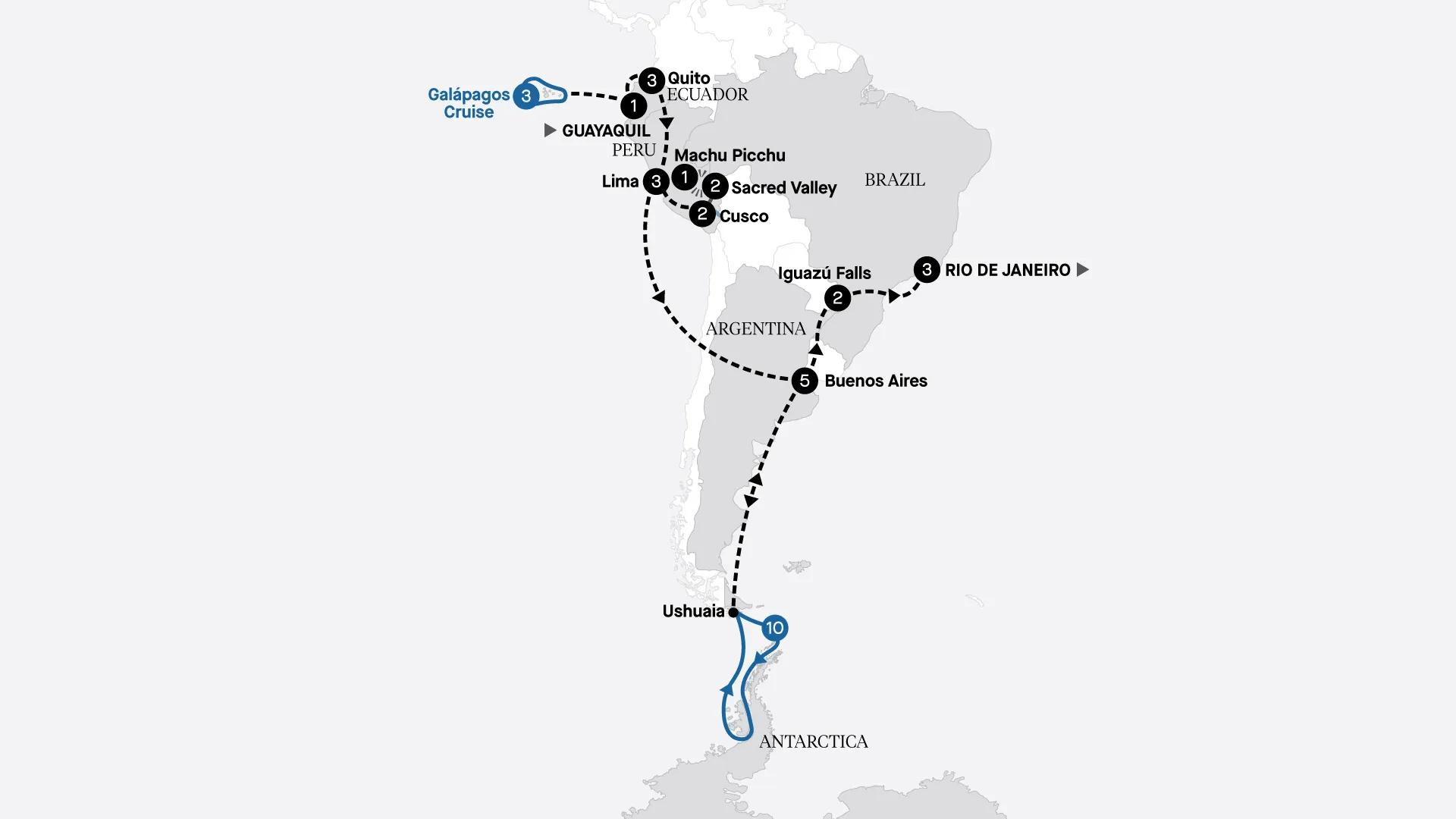 This epic adventure will take you deep into some of the world’s most unique and pristine environments. Spend time discovering the wildlife of the Galápagos Islands, travel through South America’s most incredible cities and landscapes, then embark on an Antarctic expedition of a lifetime in true luxury.