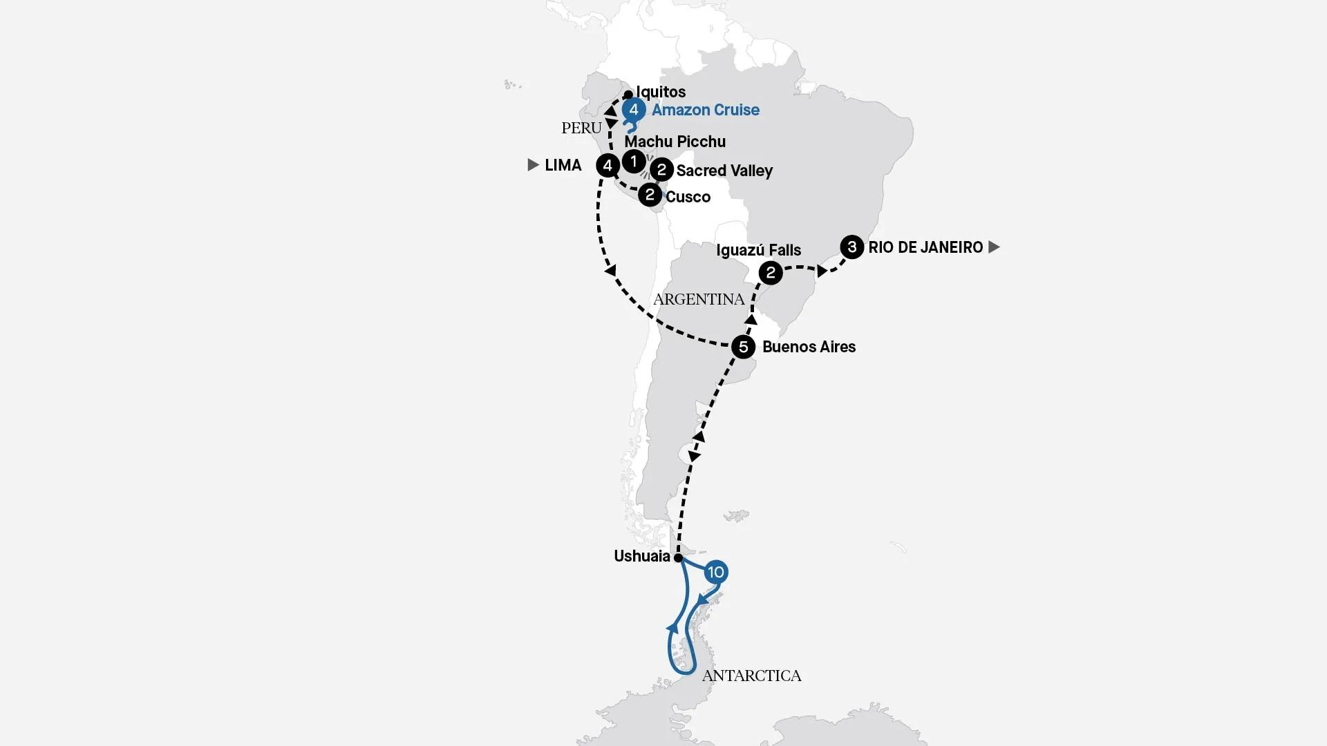 Begin your journey with a four-night cruise along the Peruvian Amazon and see the most amazing landscapes. Discover incredible archaeological sites and iconic cities in South America before boarding your luxury expedition ship for a once-in-a-lifetime cruise to the Antarctic Peninsula. On Zodiac excursions get up close to icebergs, glaciers, whales, penguins and seals, and learn about this pristine environment from your expedition team.