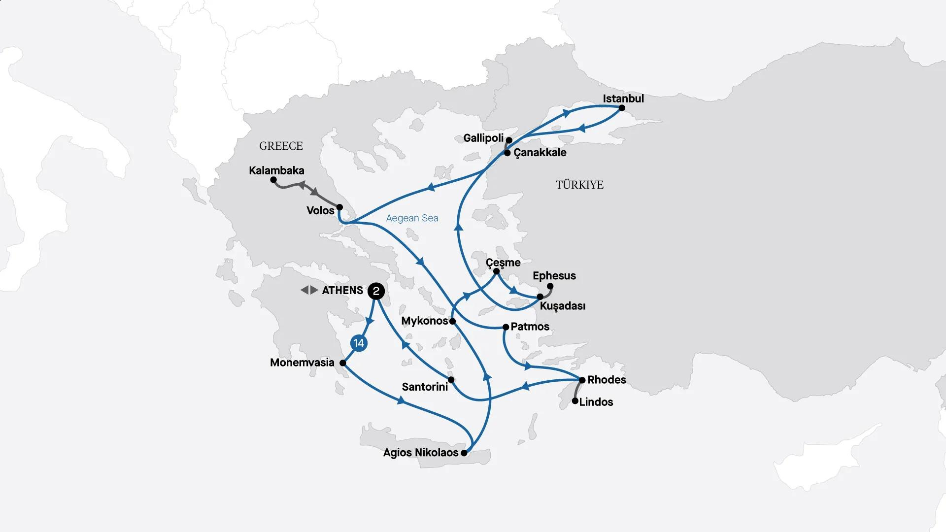 Uncover the treasures of the Greek Isles and Türkiye on this epic cruise, beginning and ending in the timeless city of Athens. Discover remote islands accessible only to small ships like yours, and step ashore for gentle explorations of charming medieval towns, where you’ll sample local snacks paired with regional liqueurs. Visit iconic islands famed for their whitewashed architecture and vivid blue accents. In Türkiye, journey to the historic Gallipoli Peninsula to experience the powerful Anzac legacy, and enjoy an exclusive after-hours visit to the ancient city of Ephesus, accompanied by a private classical music performance.