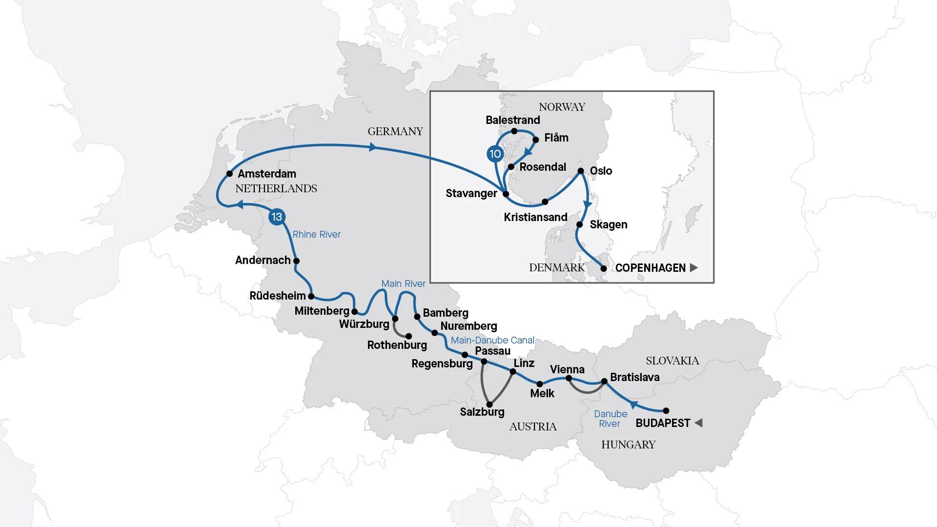 Journey through the heart of Europe and the breathtaking coasts of Scandinavia on this extraordinary voyage. Begin with a luxury river cruise along the Rhine, Main and Danube, where grand cities like Budapest, Vienna and Amsterdam meet storybook villages tucked along the waterways. Then continue north, sailing across the North Sea to Norway’s fjord country. Here, sheer cliffs, cascading waterfalls and glassy waters frame charming towns such as Flåm and Balestrand, while historic ports like Stavanger and Rosendal reveal a rich cultural heritage. Conclude your journey in Copenhagen, a vibrant city where royal palaces and cobbled streets mingle with modern design. From Europe’s iconic rivers to Scandinavia’s natural wonders, this journey captures the very best of two remarkable worlds.