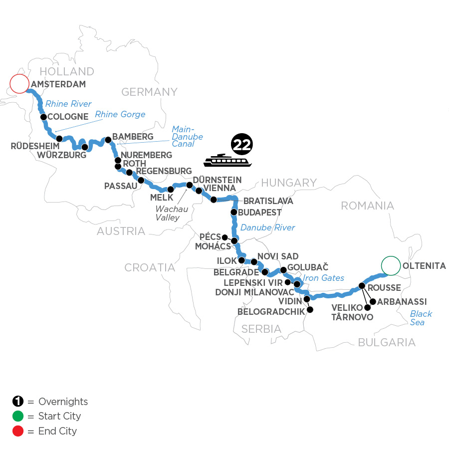 The City of Seven HillsCLASSIC Take a Guided Walking Tour of the former home to imperial dynasties, and see its Romanesque cathedral, Old Town Hall, and seven hills crowned with churches. DISCOVERY Attend an onboard lecture to learn about European history and culture.AFTERNOON/OVERNIGHT CRUISE TO WÜRZBURG (B,L,D)