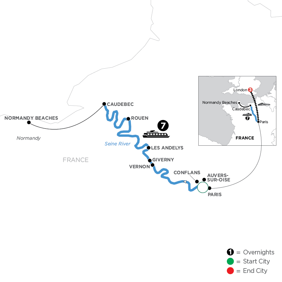 Welcome to France. Your Suite Ship® is Ready for BoardingFlights into Paris must arrive by 2:30 pm. Guests must be on board ship by 5 pm.Your day is free to explore the world’s most romantic city before starting your cruise on the Seine. Get acquainted with the City of Light today with some shopping, strolling, or with a croissant and café au lait to watch the world go by amid the Parisian cityscape.EVENING/OVERNIGHT CRUISE TO VERNON(D)