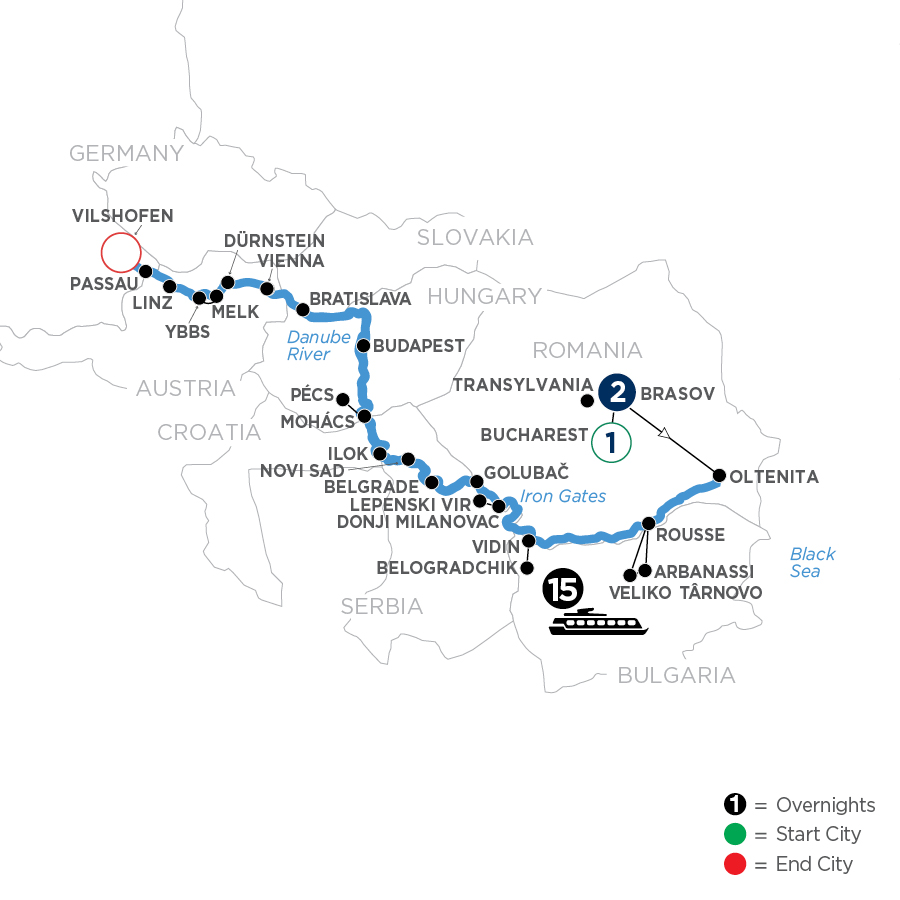 Fortresses and Fountains in “Little Vienna”ACTIVE Join a bike tour in Rousse with your Avalon Adventure Host, OR:CLASSIC Join a Guided Sightseeing Tour of Bulgaria’s largest inland port and visit its impressive Holy Trinity Church. Later, enjoy a short scenic drive to explore the rock-hewn churches of Ivanovo, a UNESCO World Heritage, OR:CLASSIC Join a full-day Guided Tour to the former Bulgarian capital of Veliko Târnovo—with its ancient stone houses clinging to the cliffs above the Yantra River. Discover one of the oldest towns in Bulgaria, as well as Bulgarian revival architecture in the 15th-century town of Arbanassi.Sail to Svistov or join your ship there if you opted for the full-day tour.EVENING/OVERNIGHT CRUISE TO VIDIN(B,L,D)