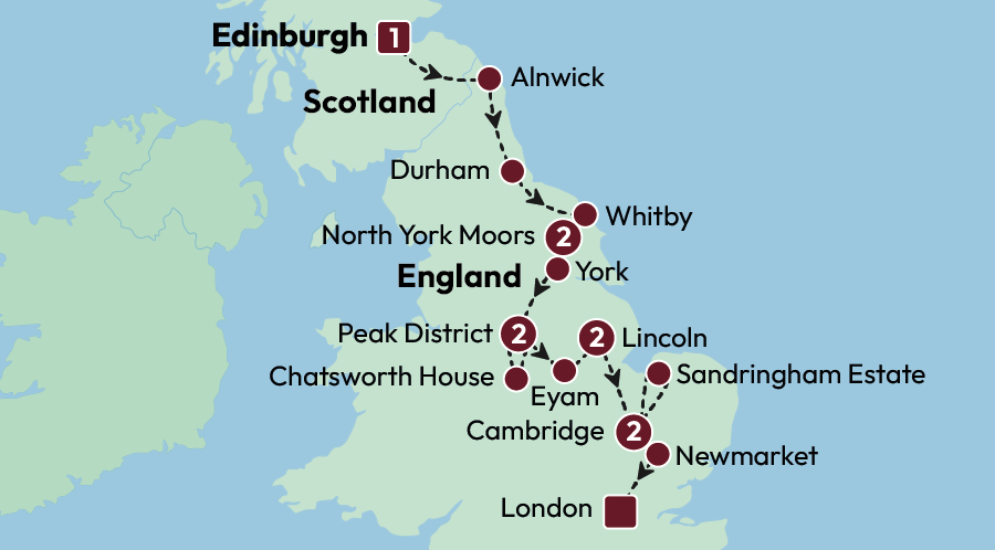 Trace your way along the East of England, where the North York Moors enthrall with sweeping vistas and university cities charm with centuries-old architecture. Discover the romance of this enchanting region as you glide along the glistening River Cam on a traditional punt, soak up the cosy chatter in a rustic pub with a freshly poured pint, and marvel at the grandeur of Sandringham Estate’s picturesque house and gardens. This adventure is sure to capture your heart.