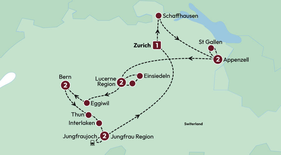 Like an exquisite painting come to life, Switzerland's otherworldly beauty unfolds before you on this journey through its picture-perfect landscapes and enchanting towns. Hear the roar of glacier-fed waterfalls, pause for dreamlike views from mountaintops and indulge in local chocolate, cheese and beer. With its pinch-me moments, Switzerland is sure to leave a lasting impression.