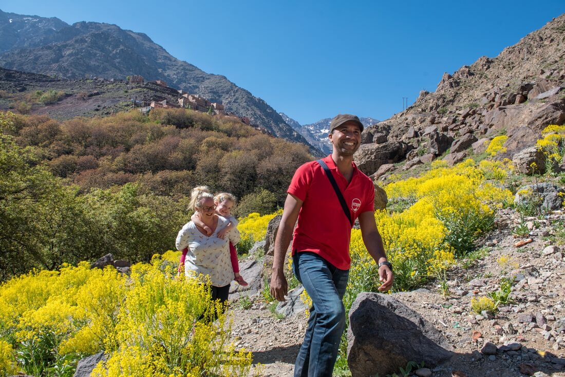 Make your way to the High Atlas Mountains, passing Tizi n'Tichka Pass (2260 m above sea level) and Toubkal National Park. Along the way, snow-capped mountains and valleys in full flower will fly by your window – don’t worry, you’ll make a couple of stops for photos! When you arrive in the town of Aroumd, the kids can climb aboard donkeys and make their way to Imlil (the adults will be on foot and the walk takes about an hour). Witness traditional mountain village life far from the reach of the modern world and arrive in the remote village of Imlil – sitting on a rocky outcrop, this town has amazing views across the High Atlas Mountains and a unique opportunity to experience traditional Amazigh culture. You’ll spend the night in a family-run mountain home (or gite). Surrounded by the smell of woodstoves and bread, you’ll meet the host family and enjoy some traditional Amazigh hospitality and homecooked food as you swap stories and learn about their lives in the village.