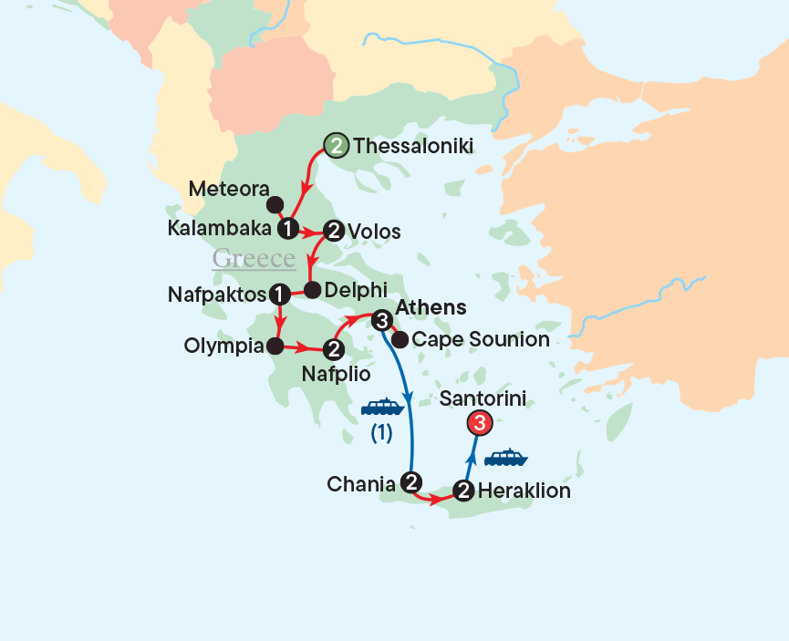 Welcome to Greece! Often cited as the birthplace of European civilisation, Greece offers a heady mix of ancient archaeological sites, chic hotels, rustic tavernas and seaside escapes. Scattered throughout the calm blue waters of the Ionian and the Aegean Sea are Greece’s 3,000 islands, each with their own magical story. Our journey will take us through mainland Greece, as well as several beautiful island locations – are you ready?