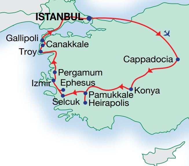 Explore Turkey's highlights on our small-group Charming Turkey tour. Discover Istanbul, once the capital of the Roman, Byzantine, and Ottoman Empires; the ancient port city of Ephesus; the mineral-rich thermal waters and white travertine terraces of Pamukkale; and Anzac Cove at Gallipoli. Take a flight (airfare included) to Cappadocia in central Turkey, view the pigeon houses carved into the rocks, and explore one of the UNESCO World Heritage Sites – the Göreme Open-Air Museum.