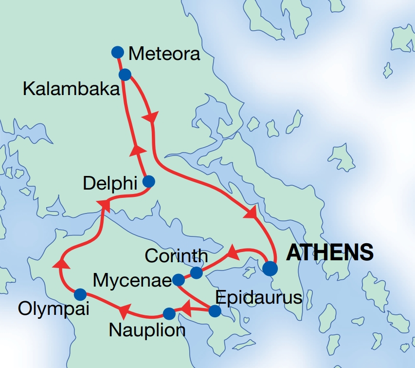 Regular bus coach tour. The tour departs Athens with a short stop at Corinth canal, then a visit to the ancient theatre of Epidaurus. Proceed to the archaeological site of Mycenae and the Tomb of Agamemnon, before continuing to Olympia, the birthplace of the Olympic Games. Visit Delphi and the Temple of Apollo and the famous monasteries of Meteora, built atop towering rock pillars.
