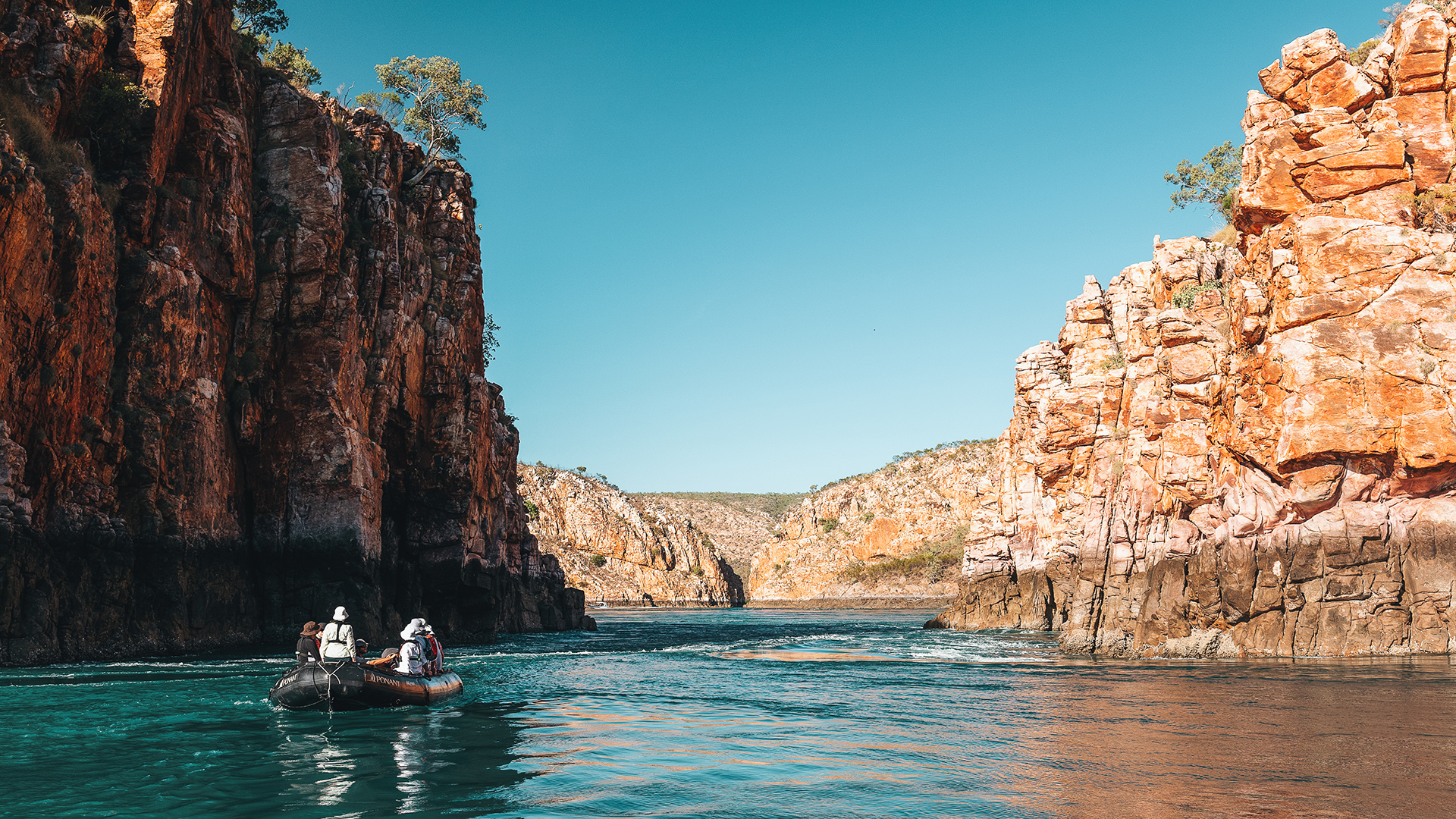 Lying to the east of the Buccaneer Archipelago, the ancient landscapes of Collier Bay have been shaped by massive tidal movements, creating a photographer’s paradise. With a tidal range exceeding 14 metres, this movement of water creates a unique phenomenon. Nestled in the centre of the bay is Montgomery Reef, the world’s largest inshore reef system. As the tide falls a raging torrent of water cascades off the top of the reef, creating turbulent ‘rivers’ and mini waterfalls. Nestled at the southern end of Buccaneer Archipelago is Talbot Bay, home to the world’s only ’Horizontal Falls’ and described by Sir David Attenborough as “one of the greatest wonders of the natural world.” Hidden in the many caves and grottos of this ancient landscape are a multitude of ancient rock art galleries. Activities here will be determined by the weather and tide conditions. (B,L,D)