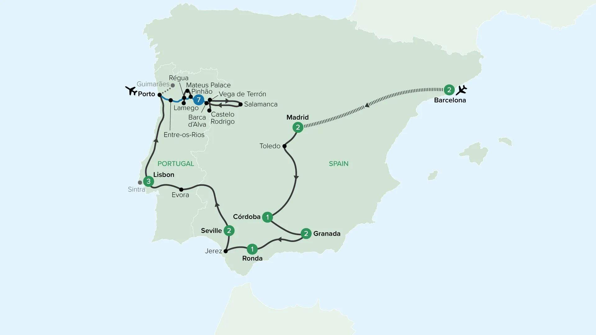 - Three nights in Lisbon; two nights in Barcelona, Madrid, Granada and Seville; one night in Cordoba and Ronda