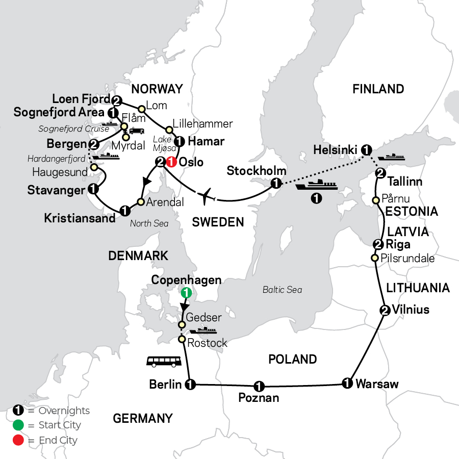 Stop in Lom to see its iconic wooden stave church, dating back to the 12th century. Visit Lillehammer, host of the 1994 Winter Olympics and home today to a lively art scene. Overnight in Hamar, located on the eastern shore of Mjøsa, the largest lake in Norway. Today’s Distance: 224 mi/ 360 km (B)