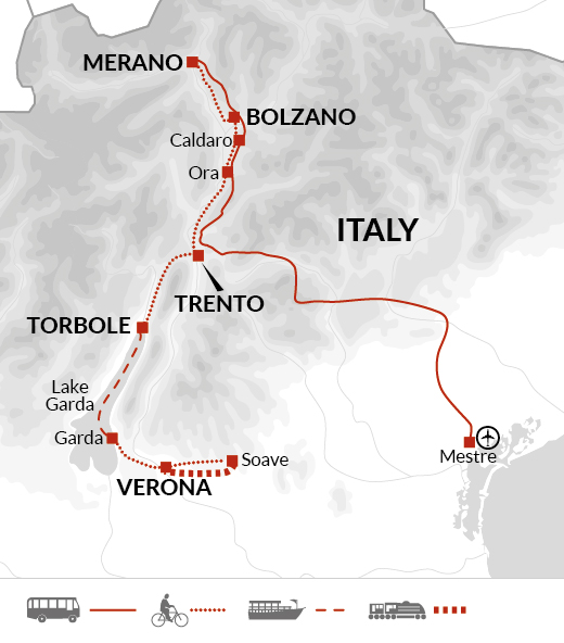 Pedal through the glacial valleys of the South Tyrol, past the jagged backdrop of the Dolomites to the stunning shore of Lake Garda on our Italian cycling holiday. Along the way, tick off cultural gems, including the piazzas of fair Verona. Unwind as you go, stopping to sample local wines and staying in charming villages and alpine towns.