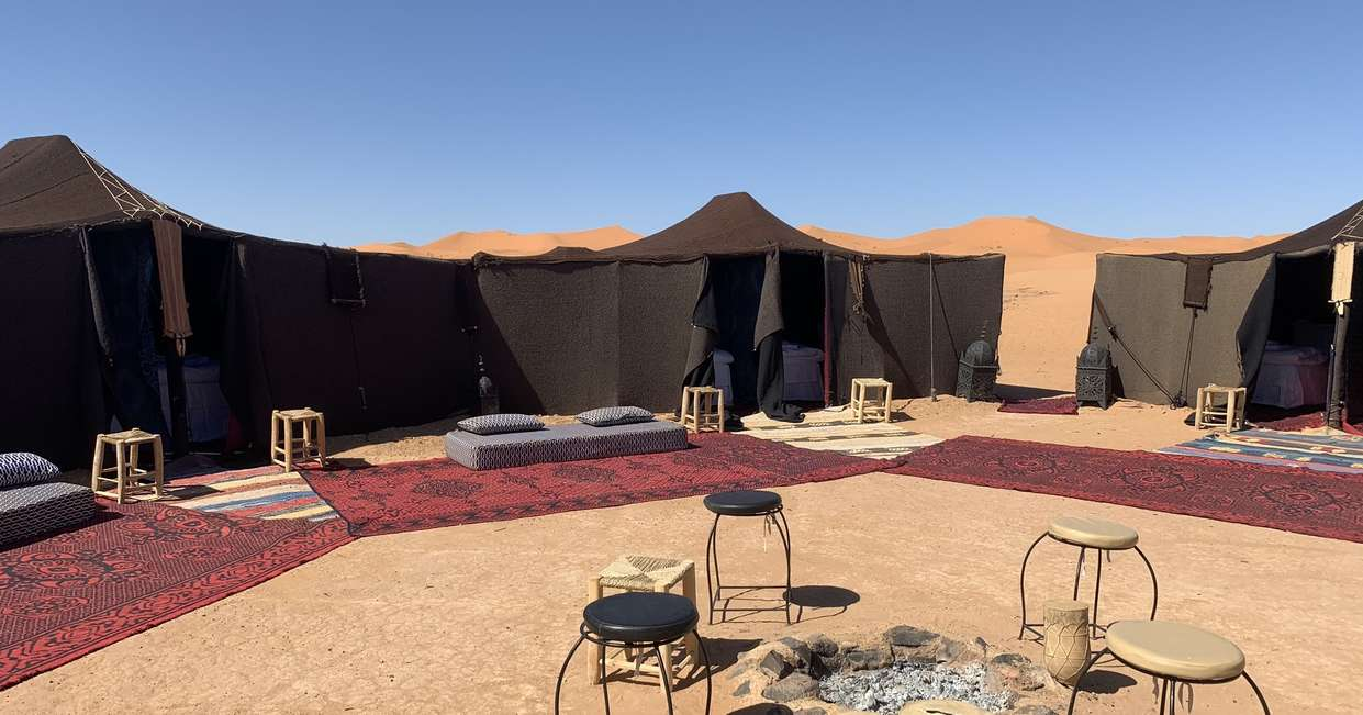 Our camelback caravan will lead us to our camp for tonight, right here on the Erg Chebbi sands. We'll experience the tranquillity of the desert at a Berber camp. Our camp is basic but comfortable - the twin share tents are fully equipped with full size single beds with mattresses, blankets, and pillows and there are charging points for phones and cameras. The camp site is right on the edge of the magnificent sand dunes, after a refreshing glass of mint tea you may wish to take a stroll amongst the dunes to witness the sun setting over the Sahara desert, the light at this time in the late evening casts shadows over the dunes making them a photographers dream. Dinner is served under the stars after which we retire to a campfire. Note that the camp has shared bathroom facilities, showers are simple and hot water and good water pressure aren't guaranteed.