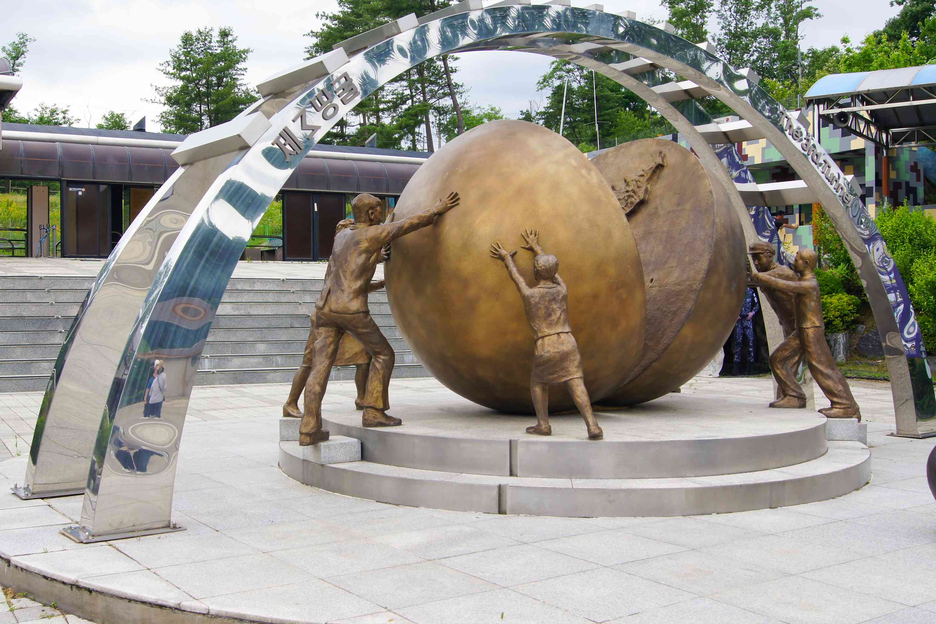 Our tour continues at the Dora Observatory and Dorasan Station, which allow us a peak into North Korea and the village of Kijŏng-dong. Often referred to as the propaganda village, it was designed by the North Koreans to show that the North is living a life of prosperity. A closer look indicates that they are all concrete shells with no windows and automatic lighting that switches on and off at designated times to suggest activity!