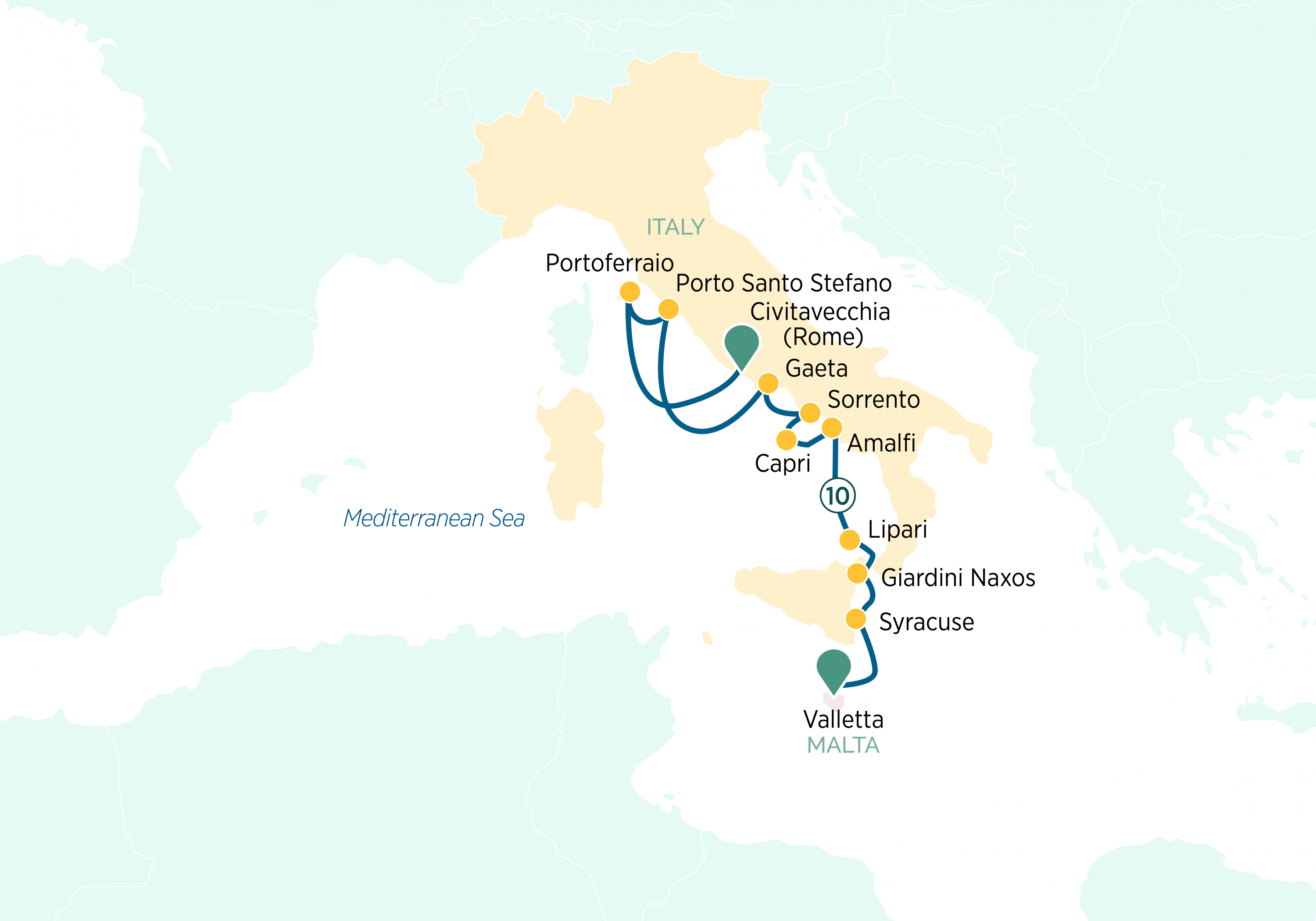 Begin your journey on the island-nation of Malta and its tiny capital, Valletta, a well-preserved fortified city and World Heritage-listed Site. From here, cruise to Italy and first stop, the stunning Island of Sicily, exploring the historic destinations of Syracuse and Giardini Naxos, both enthralling for their archaeological sites dating back to ancient Greek and Roman times. There’s ample opportunity to relax on the pristine beaches of Lipari, a striking volcanic archipelago. Cruising northwards along the Italian coastline, you’ll be entranced by the spectacular settings, cultural charm and mouthwatering regional cuisine as you explore Italy’s fabled Amalfi Coast, Bay of Naples and Island of Capri.