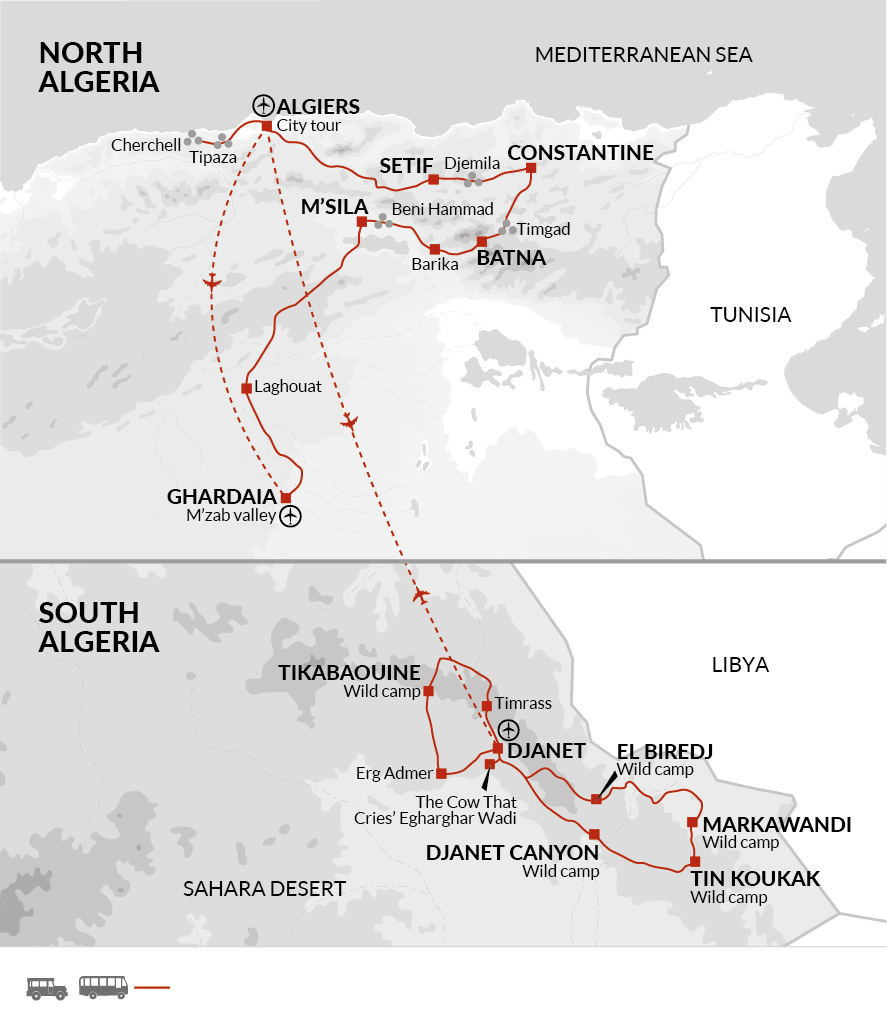 Our flight back to Algiers departs in the early hours of the morning, arriving around 6am, whilst the flight timing is subject to change, at the time of publication this flight has a short scheduled stop at Tamanrasset. The trip ends here at Algiers International airport, also known as Houari Boumediene International Airport (ALG). We recommend booking onward flights from 10am onwards in case of delays. Should you wish to book a extra night's accommodation in Algiers, please get in touch.