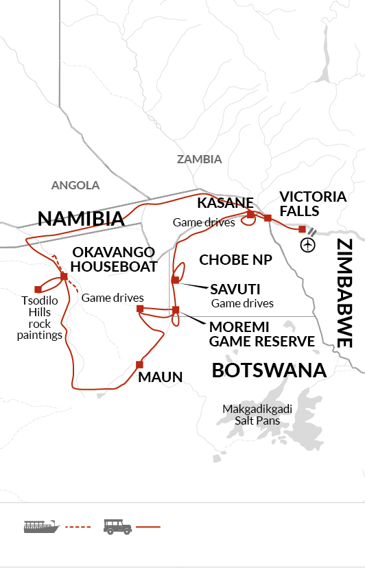 Day 13 - Witness the wonders of Victoria Falls on the Zambezi River. Free afternoon with a choice of optional activities