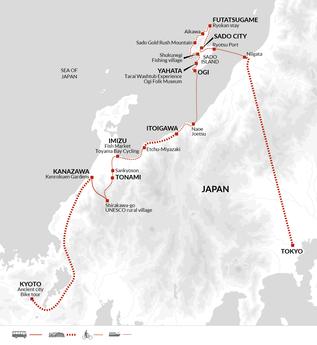 There's no destination quite like Japan, and there's no better way to see it than by bike. Get off the beaten path, cycling from the historic village of Shirakawa-go to the Sea of Japan and Toyama Bay. Explore the hidden gem of Sado Island on two wheels. Along the way we see one of the finest Japanese gardens in Kanazawa, rest your head in a traditional ryokan, sample excellent local seafood and soak in coastal scenery. Finally, hop on a bullet train to explore the neon-clad, beating heart of Japan, Tokyo.
