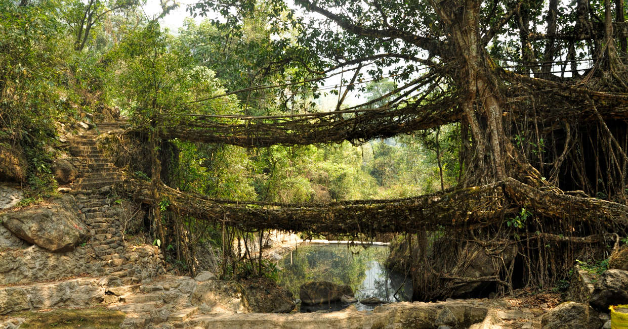 The first part of the trail takes us down a series of steep, stone steps, passing by small remote houses and on through the villages of Nongthymmai, Mynteng and Nongriat. At Nongriat we'll reach the double-decker living root bridge, a truly unique structure that, over the centuries, has been trained to span the river between two ancient rubber trees, ensuring that - even in the middle of the monsoon season - the villages are not cut off.
