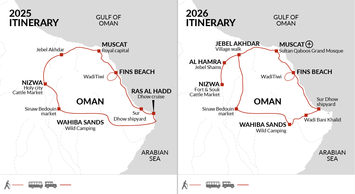 If you would like to receive an airport transfer today, you'll need to arrive into Muscat International Airport (MCT), which is just under 30-minute drive from the airport. If you are booking your own flights, we recommend giving yourself approximately one hour to clear the airport. Should you miss the welcome meeting, your Leader will inform you of any essential information as soon as you catch up.