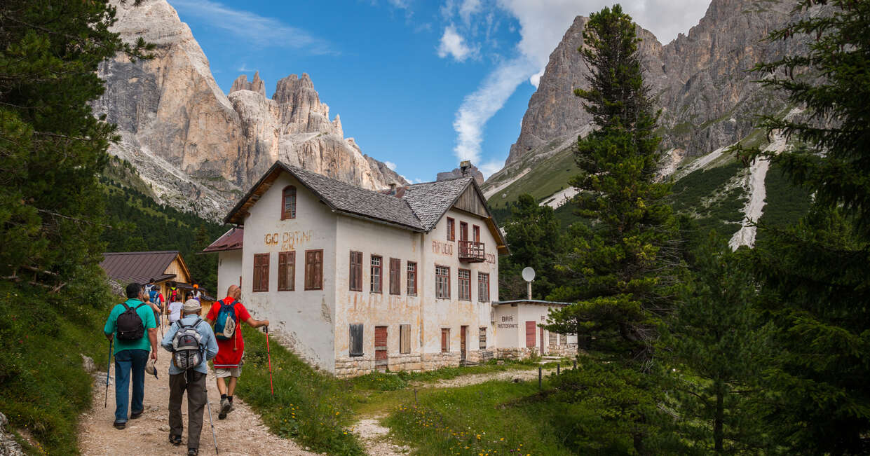 After approximately two-and-a-half hours and gaining around 500 metres/1,640 feet in elevation, we'll arrive at the picturesque Rifugio Micheluzzi (1,850 metres/6,069 feet). This charming mountain hut is beautifully situated with panoramic views, making it an ideal spot for a well-deserved break and where we plan to have our picnic lunch.