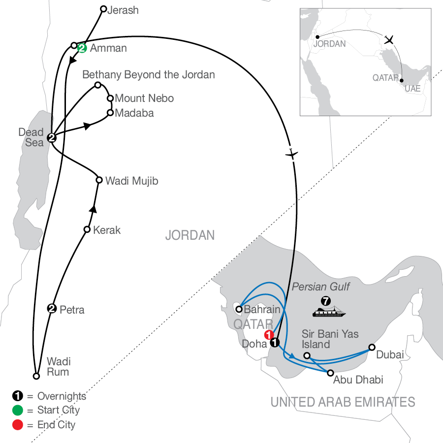 Today, bid good-bye to Jordan as you board your flight to Doha, capital of Qatar. On arrival a Local Host will meet you and accompany you to the port for embarkation. (B)
