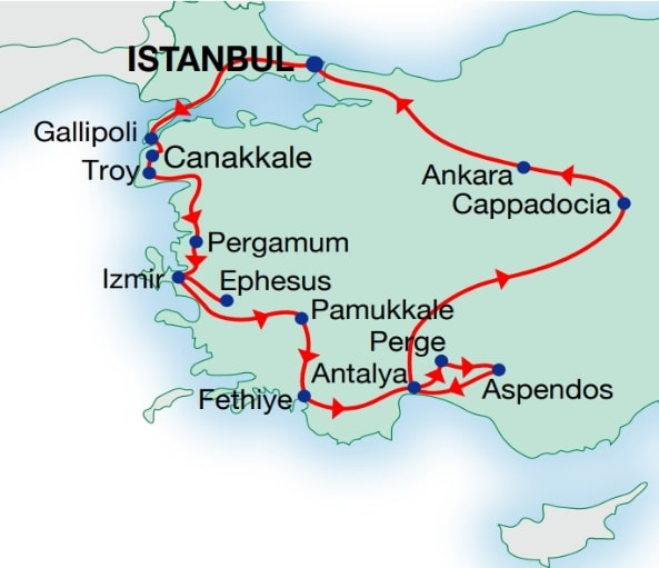 One of the most popular coach tours of Turkey, featuring a 15-day/14-night itinerary with first-class hotel accommodations, travel in a business-class-style coach, and the services of an English-speaking guide. Visit Istanbul, Gallipoli, Canakkale, Troy, Pergamum, Izmir, Pamukkale, Fethiye, Antalya, Cappadocia, and Ankara. Limited to a small group of a maximum of 22 participants.