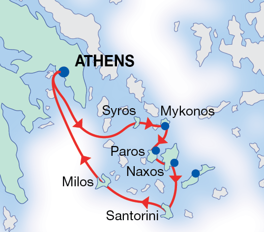 Discover the best of the Cyclades on this unforgettable 19-day adventure. Departing from Athens, visit Syros, Mykonos, Paros, Naxos, Santorini, and Milos — a perfect mix of iconic highlights and hidden gems. This tailor-made journey is the ultimate Greek island experience.