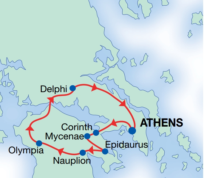 The tour departs Athens with a short stop at Corinth canal, then a visit to the ancient theatre of Epidaurus. Proceed to the archaeological site of Mycenae and the Tomb of Agamemnon, before continuing to Olympia, the birthplace of the Olympic Games. Visit Delphi and the Temple of Apollo and travel back to Athens via the picturesque village of Arachova.