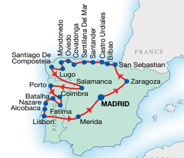 Explore northern Spain and Portugal on this 13-day multilingual (English and Spanish) coach tour, visiting historic cities from Zaragoza and San Sebastián to Santiago de Compostela and Salamanca, then Porto, Fátima, Lisbon, and Mérida. Experience UNESCO sites, Roman ruins, medieval streets, and local culture along the way. The tour finishes in Madrid (accommodation in Madrid not included).