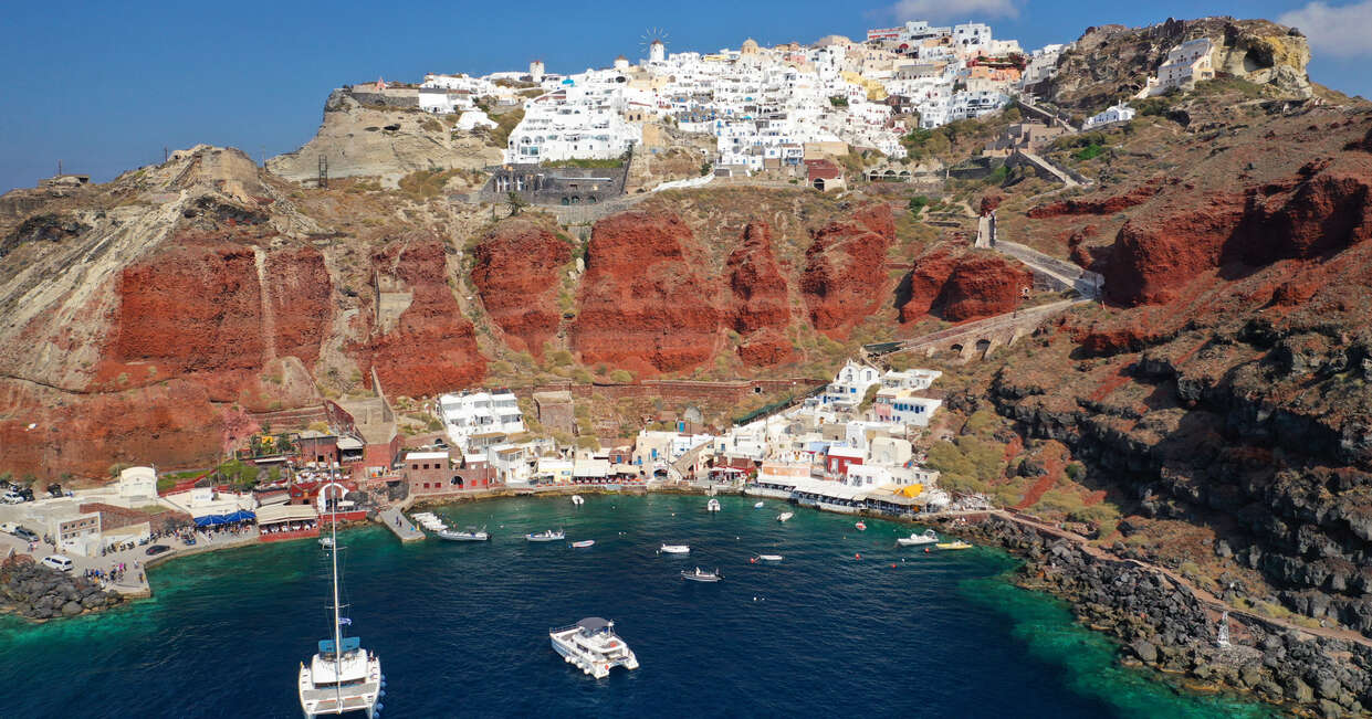 The town of Oia, on the northwestern tip of Santorini, is built along a rocky stretch of coastline and is one of the most photogenic spots on the island. It has an age-old seafaring culture and there are two types of houses here - the whitewashed cave houses that are dug into the volcanic rock in the cliffside and the captain houses above ground where the upper-class ship owners once lived.