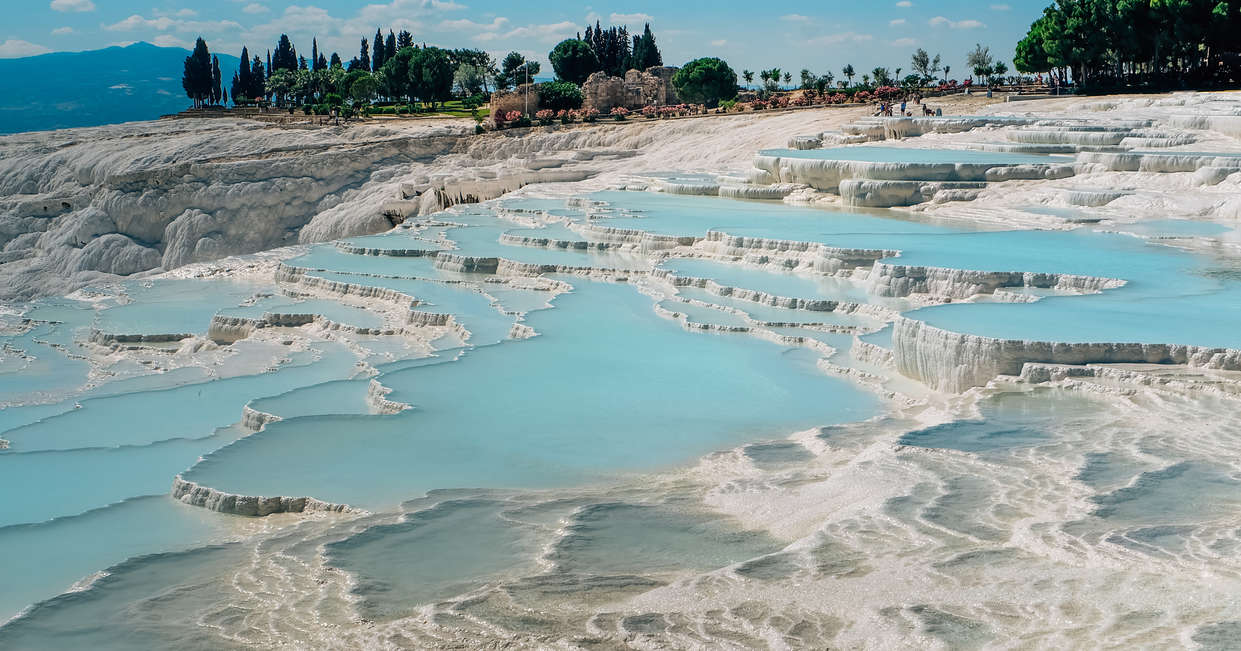 Today we'll discover Pamukkale. The city's name translates as the 'cotton castle' and is inspired by the extensive white terraces that cover the hillside, created by the white calcareous concretions deposited by mineral springs. It's home to one of Turkey's most impressive natural wonders - the 'frozen waterfall'. A boardwalk offers spectacular views of the unusual white terraced pools with their crystal blue waters and the valley below. Don't miss Cleopatra's Pool - an oasis of beauty with a mirror-like clarity that allows us to see deep down to the ruins below.