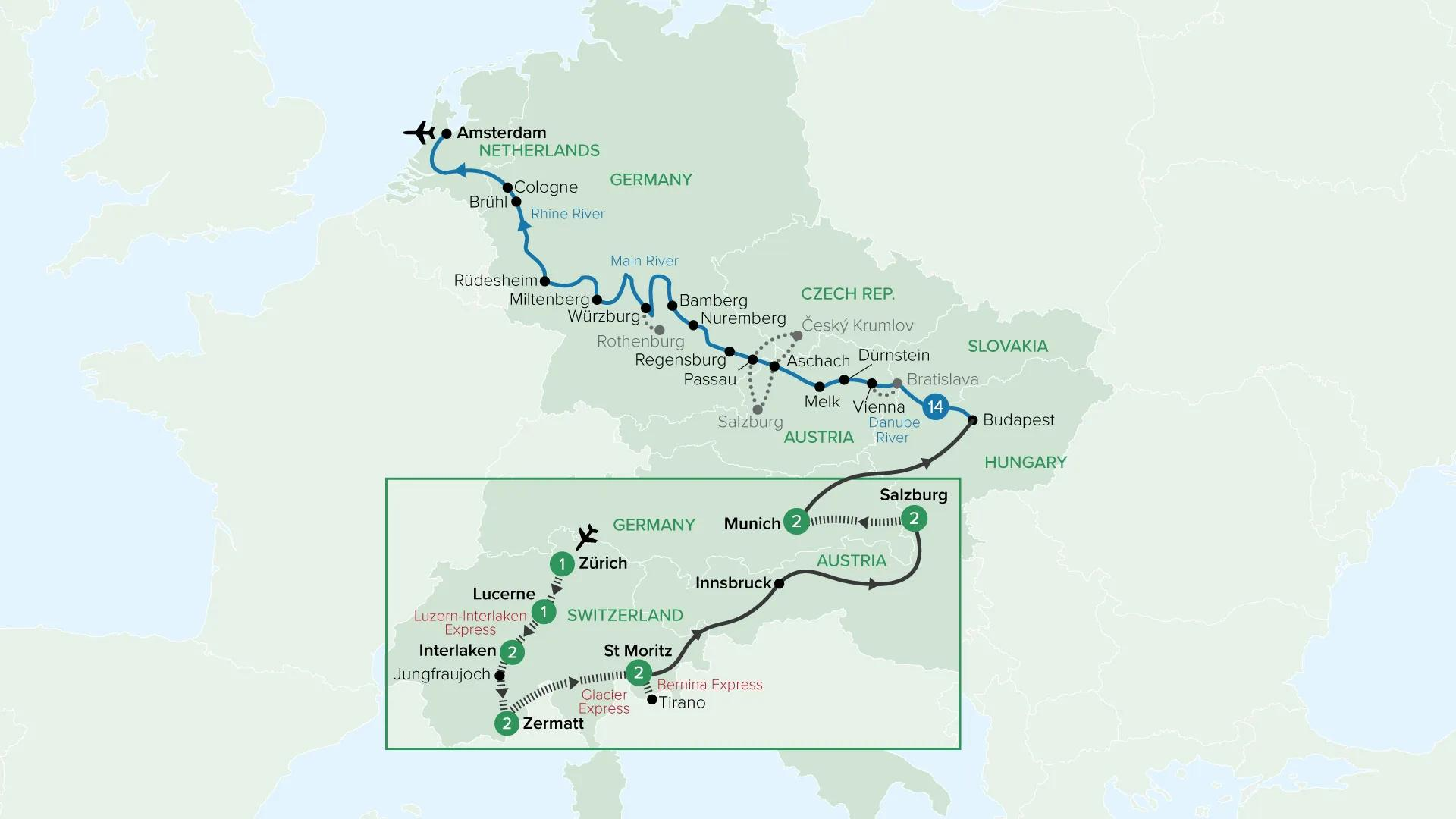 Experience the romance of Central Europe, from snow-dusted Swiss peaks to the grand capitals of the Danube and Rhine. Travel on some of the world’s most scenic rail journeys before unwinding on a leisurely river cruise through charming towns, vineyard-lined valleys and cultural icons, culminating among Amsterdam’s historic canals.