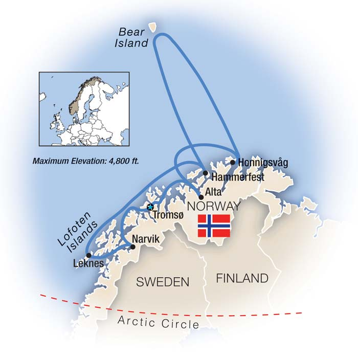 - 10-night cruise, hotel stays and sightseeing in Tromso, Narvik, Leknes, Honningsvag and Alta.