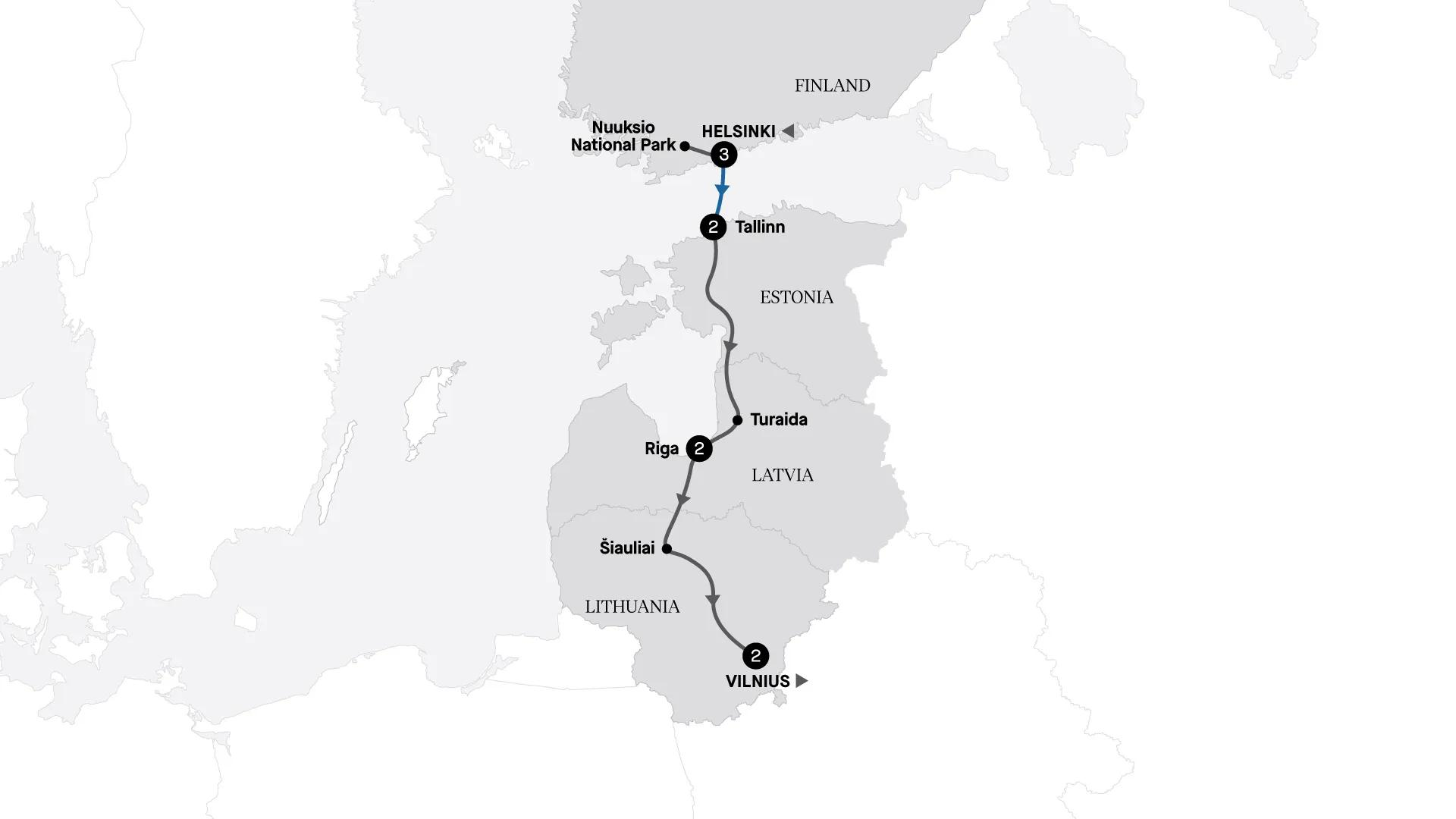 Journey from Helsinki to Lithuania over 10 unforgettable days, exploring Northern Europe’s magnificent medieval capitals. In Helsinki, discover celebrated landmarks and savour the freshest seafood while taking in sweeping city views. Venture into the serene Nuuksio National Park, where you’ll cook salmon over a crackling fire as a Sámi singer shares haunting indigenous songs. Wander Tallinn’s enchanting medieval Old Town, admire Riga’s stunning Art Nouveau architecture, and contemplate the evocative Hill of Crosses in Lithuania. This exceptional journey offers an immersive exploration of the Baltic capitals, celebrating their rich history, vibrant culture, and enduring heritage.