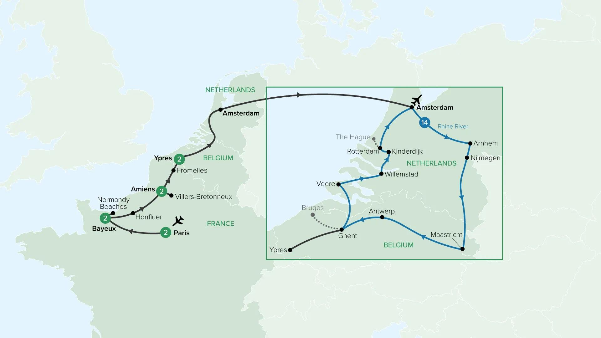 Trace Europe’s story from Paris to Amsterdam on this moving and immersive journey. Begin with two nights in Paris before travelling to Bayeux and Normandy, where you’ll visit the D-Day landing beaches and memorials. Continue through northern France to Amiens, then explore the Somme battlefields and Villers-Bretonneux. Journey on to Fromelles and Ypres, where the legacy of the world wars is revealed. Continue to the Netherlands to board your river ship and cruise the waterways of the Netherlands and Belgium to Arnhem, Nijmegen, Maastricht and Antwerp. Discover the windmills of Kinderdijk and the remarkable Delta Works. Guided tours, canal cruises and poignant Insider Experiences bring history vividly to life before your journey concludes in Amsterdam.