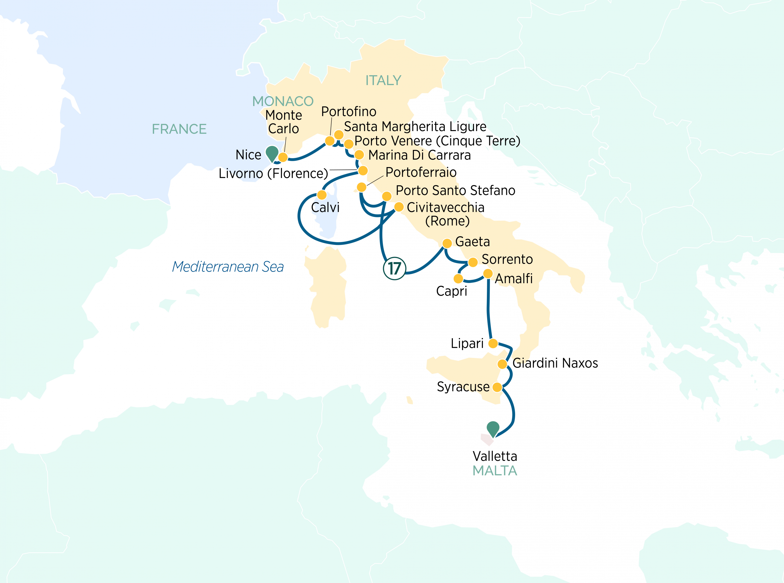 From the enchanting Maltese capital, Valletta, to the ancient seaport of Civitavecchia, discover the celebrated – and lesser-known – gems of the spectacular Mediterranean. As you cruise the sparkling coastlines of Malta, France, Monaco and Italy, set a course for historical splendours, stunning islands, rich cultural heritage and alluring charm at every turn.