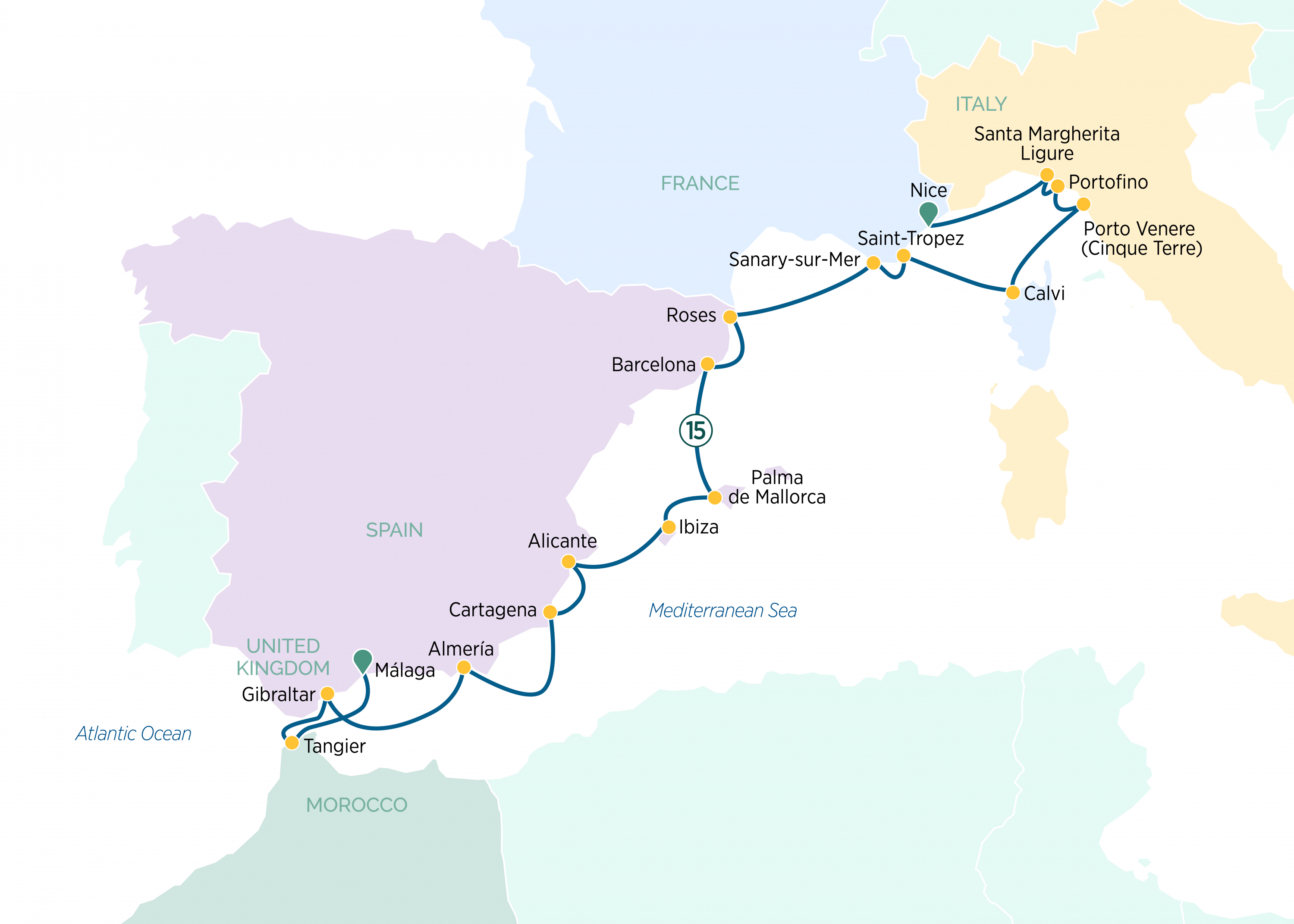 Begin your journey in the South of France, setting off from the charming port city of Nice on the chic French Riviera. From here, head to Italy and discover the storied history of Porto Venere, an ancient city dating back to the first century B.C. and the exquisite Baroque church in Santa Margherita Ligure. Enjoy ‘La Dolce Vita’ along the Italian Riviera and the pretty beaches of Saint-Tropez, a legendary hotspot along the Côte d’Azur. Continuing from Barcelona, one of Europe’s most dynamic cities, explore Spain’s stunning coastline from the delightful regions of Catalonia to Andalusia. Visit vibrant coastal cities including Alicante, and Cartagena. Marvel at the Cathedral of Santa Maria in Palma de Mallorca’s historic Old Town, experience Almeria's unique landscapes and admire the dramatic location and unique cultural blend of Gibraltar, under British rule since 1704. Cruising across the Strait of Gibraltar to North Africa and Morrocco, wander the spice-scented markets and evocative Medina of Tangier.